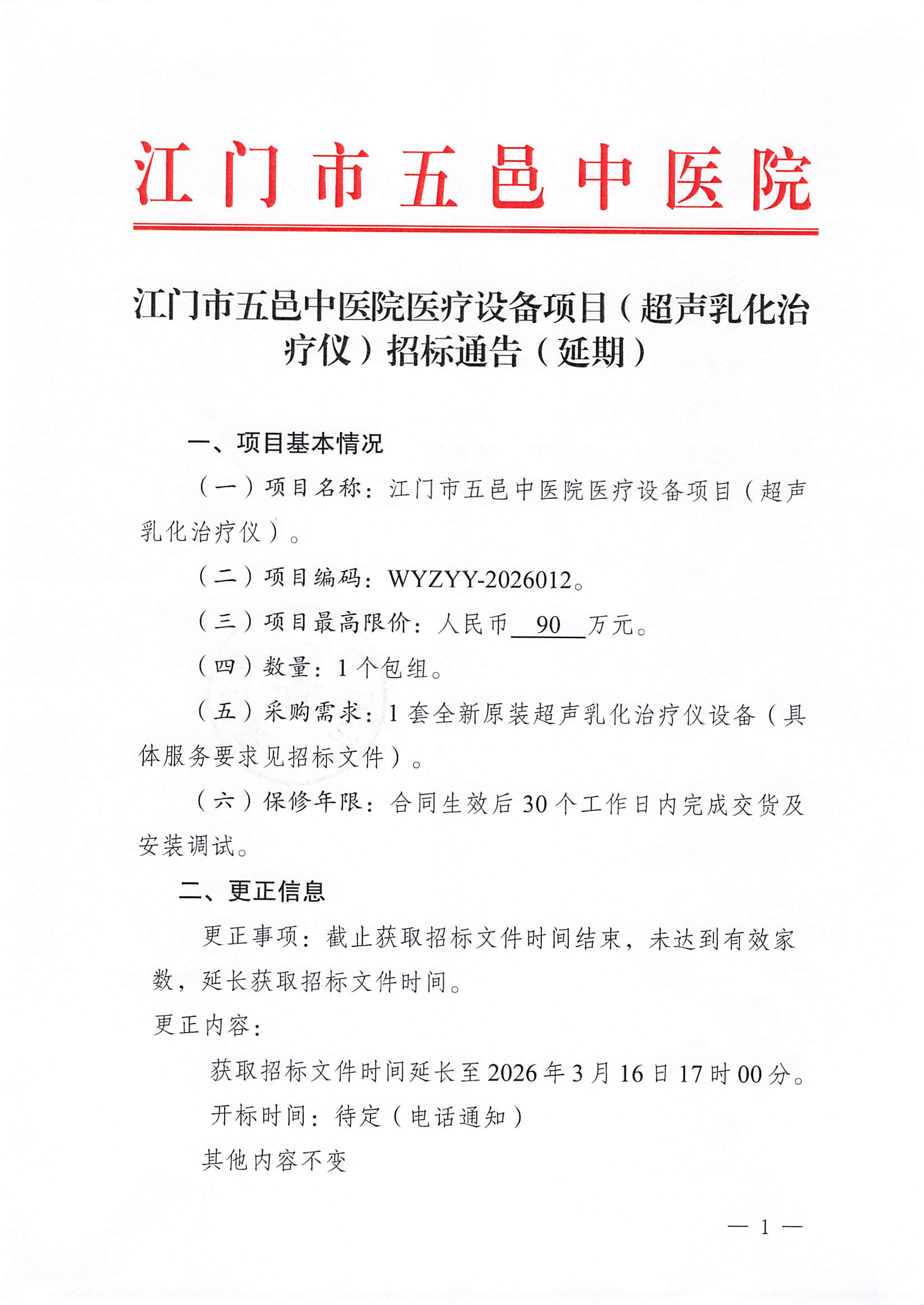 江门市五邑中医院医疗设备项目(超声乳化治疗仪)招标通告(延期)