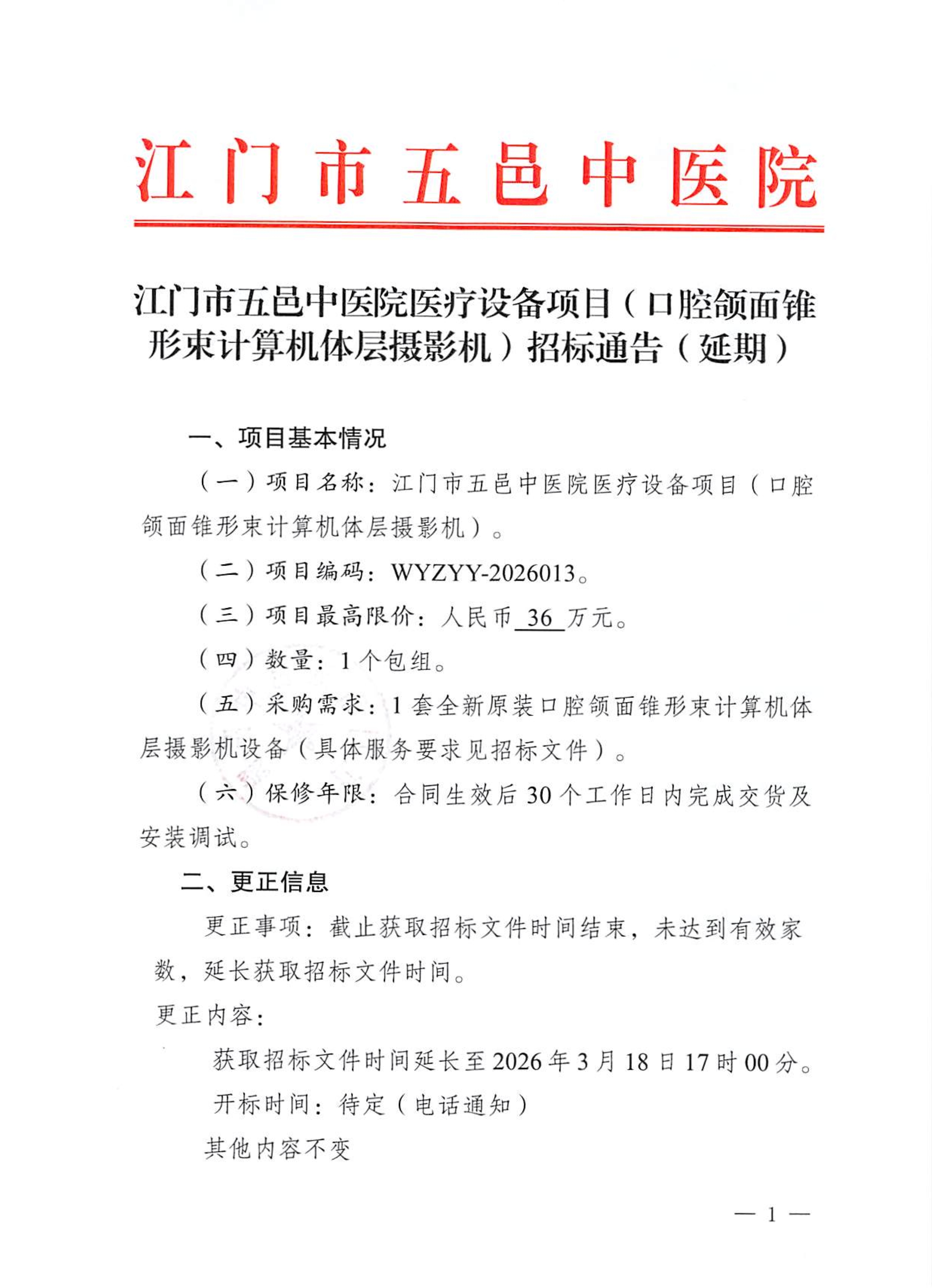 江门市五邑中医院医疗设备项目(口腔颌面锥形束计算机体层摄影机)招标通告(延期)