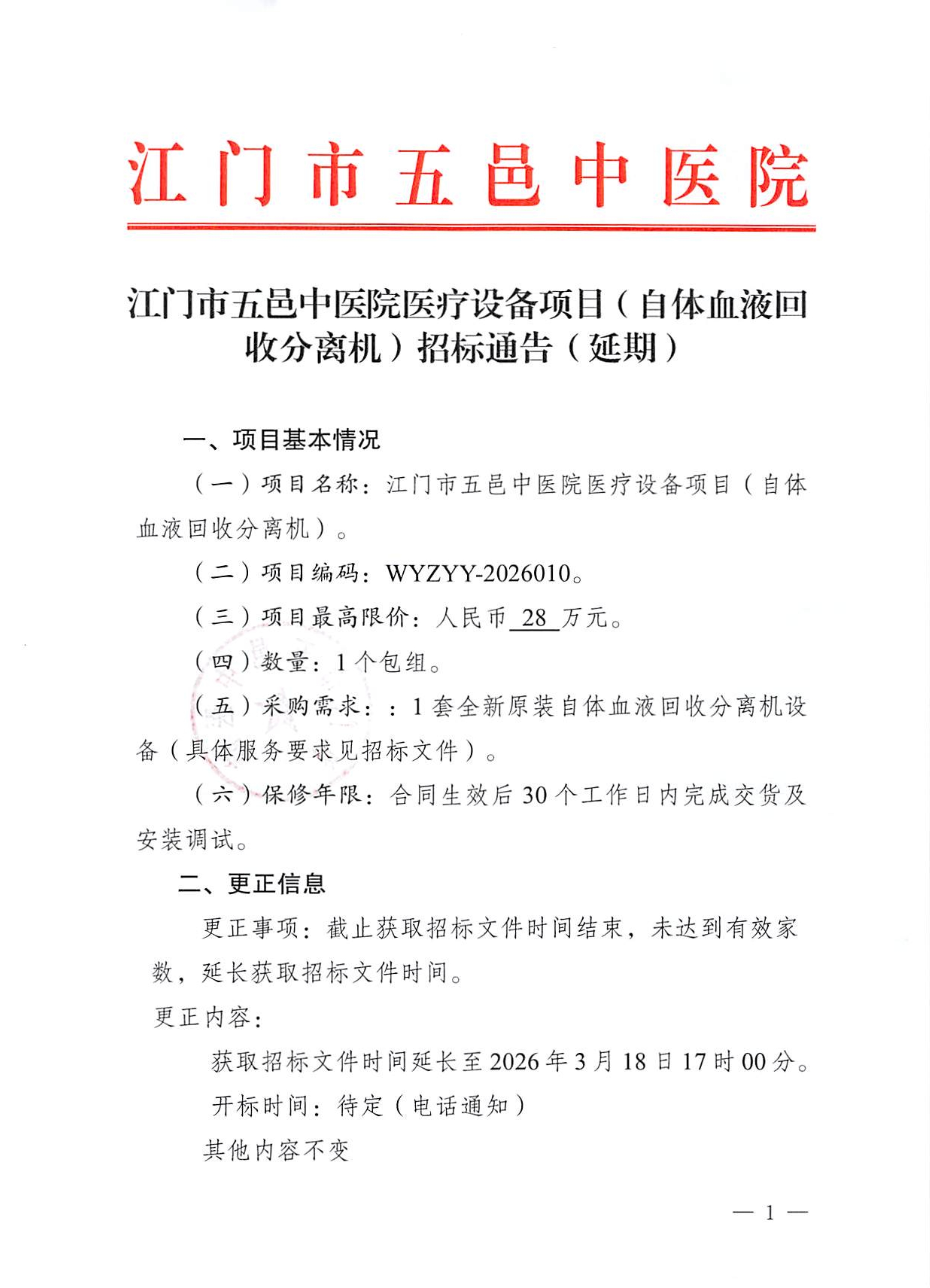江门市五邑中医院医疗设备项目(自体血液回收分离机)招标通告(延期)