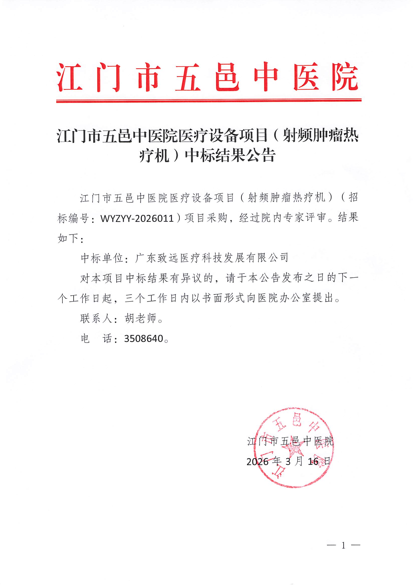 江门市五邑中医院医疗设备项目(射频肿瘤热疗机)中标结果公告