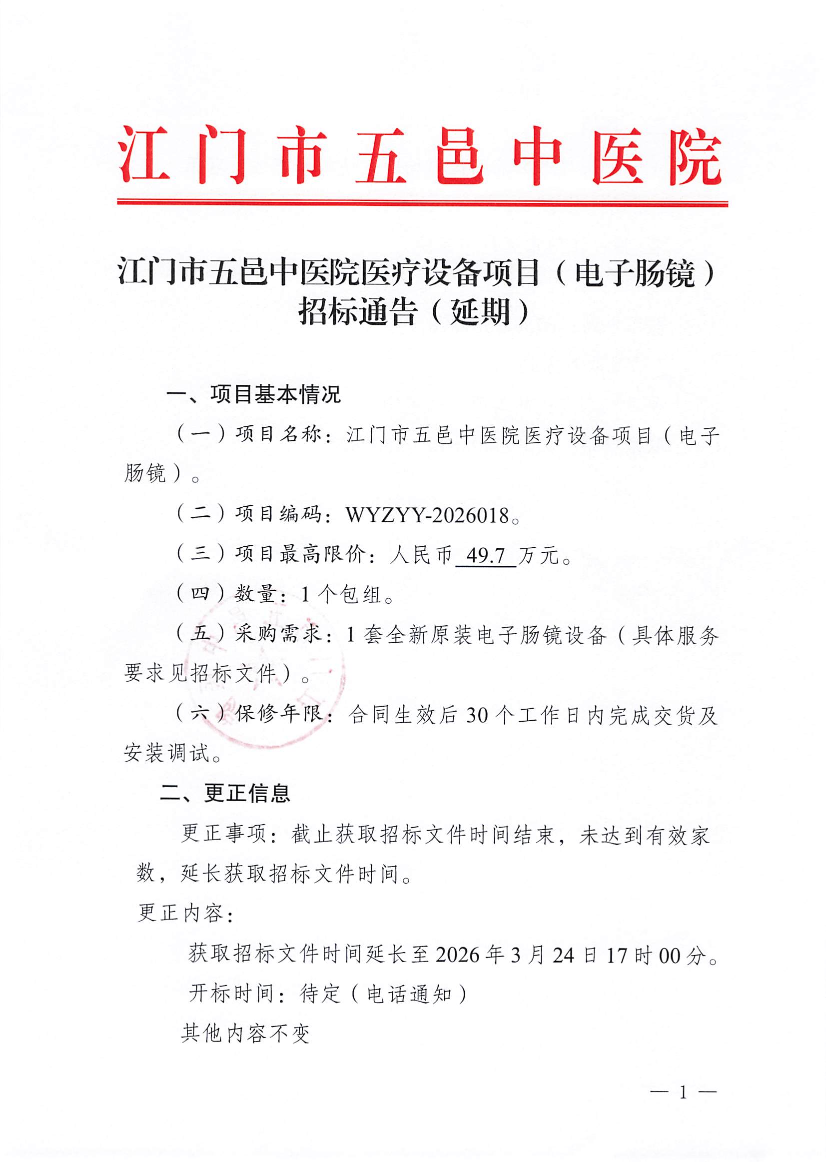 江门市五邑中医院医疗设备项目(电子肠镜)招标通告(延期)