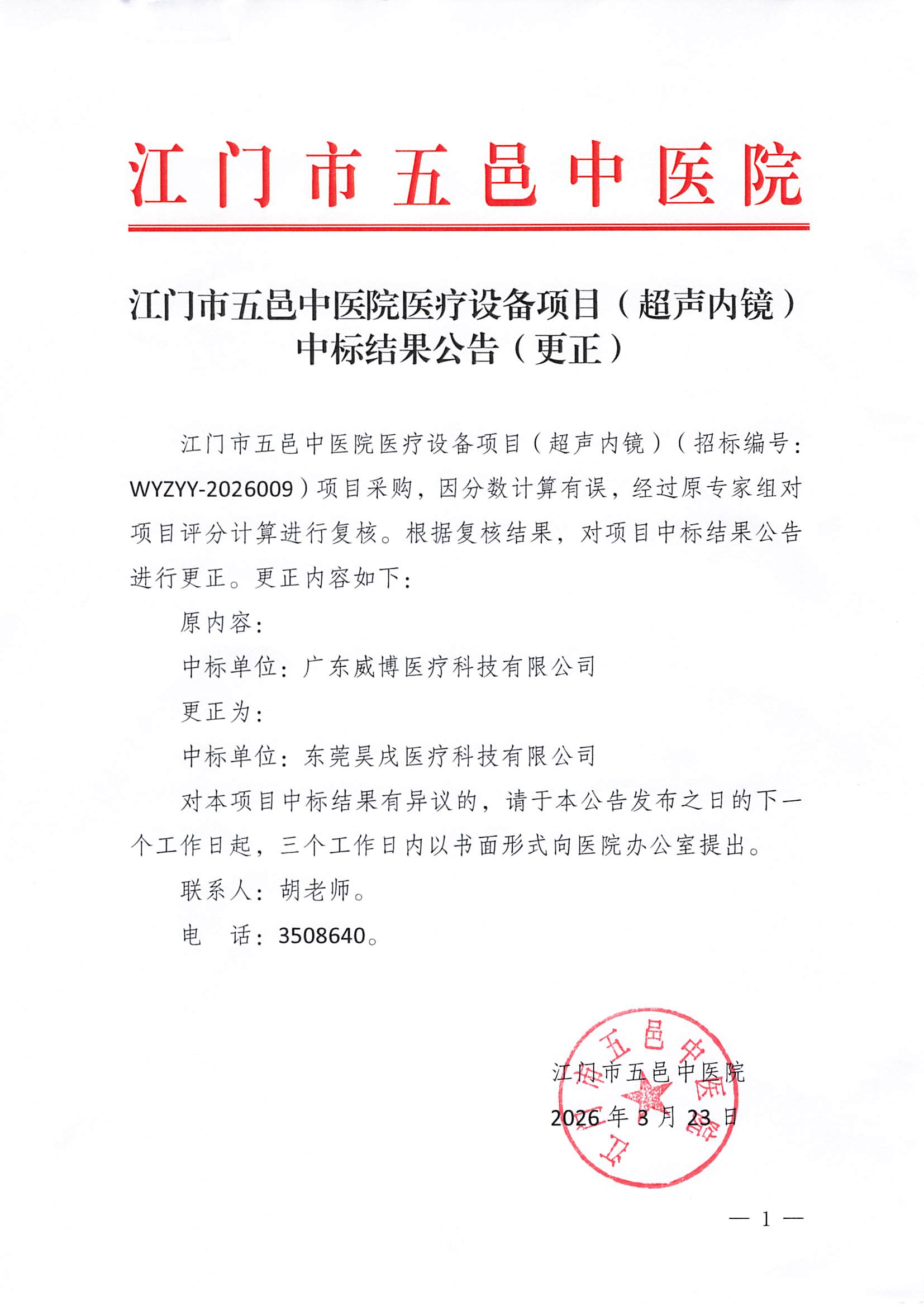 江门市五邑中医院医疗设备项目(超声内镜)中标结果公告(更正)