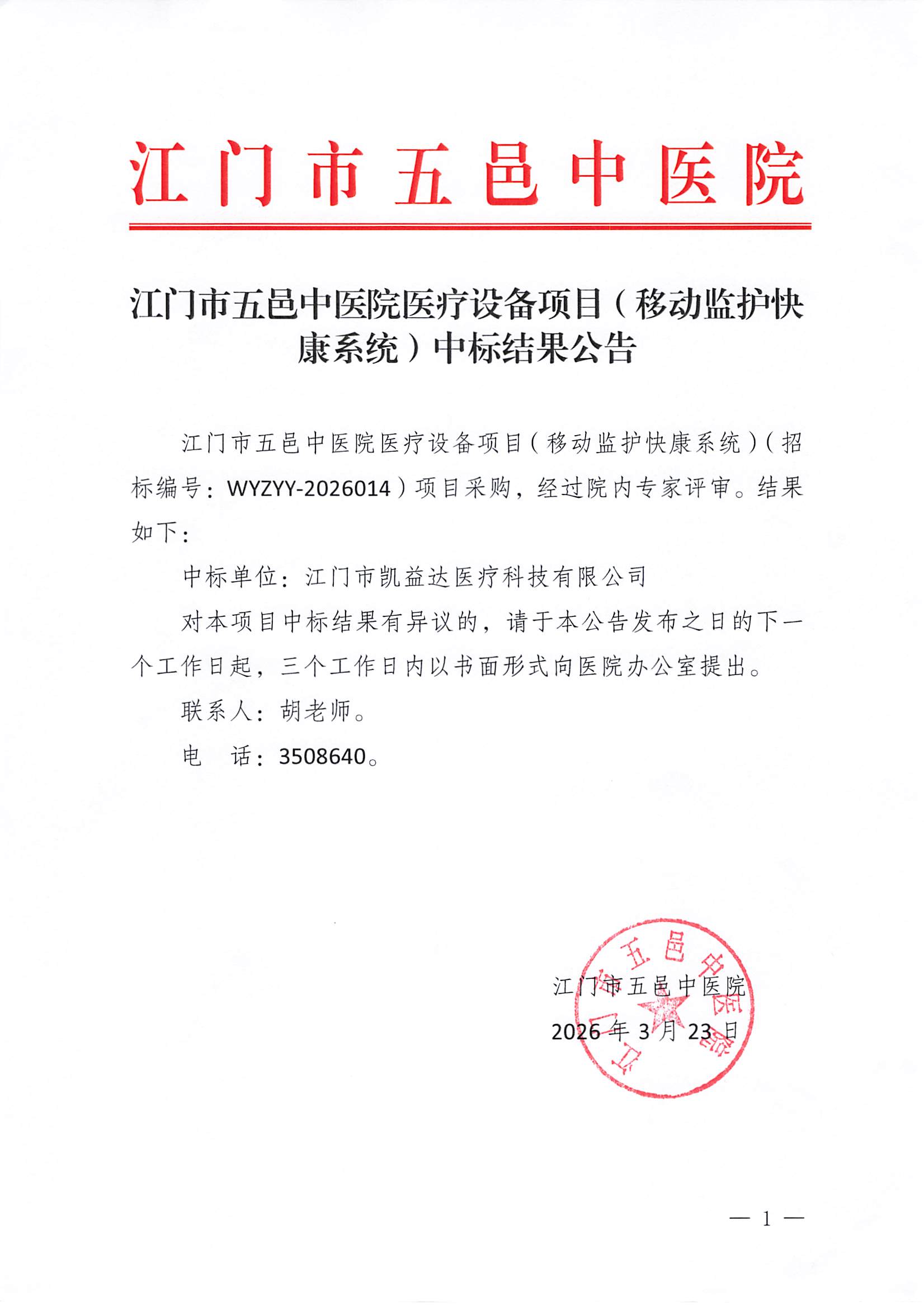 江门市五邑中医院医疗设备项目(移动监护快康系统)中标结果公告
