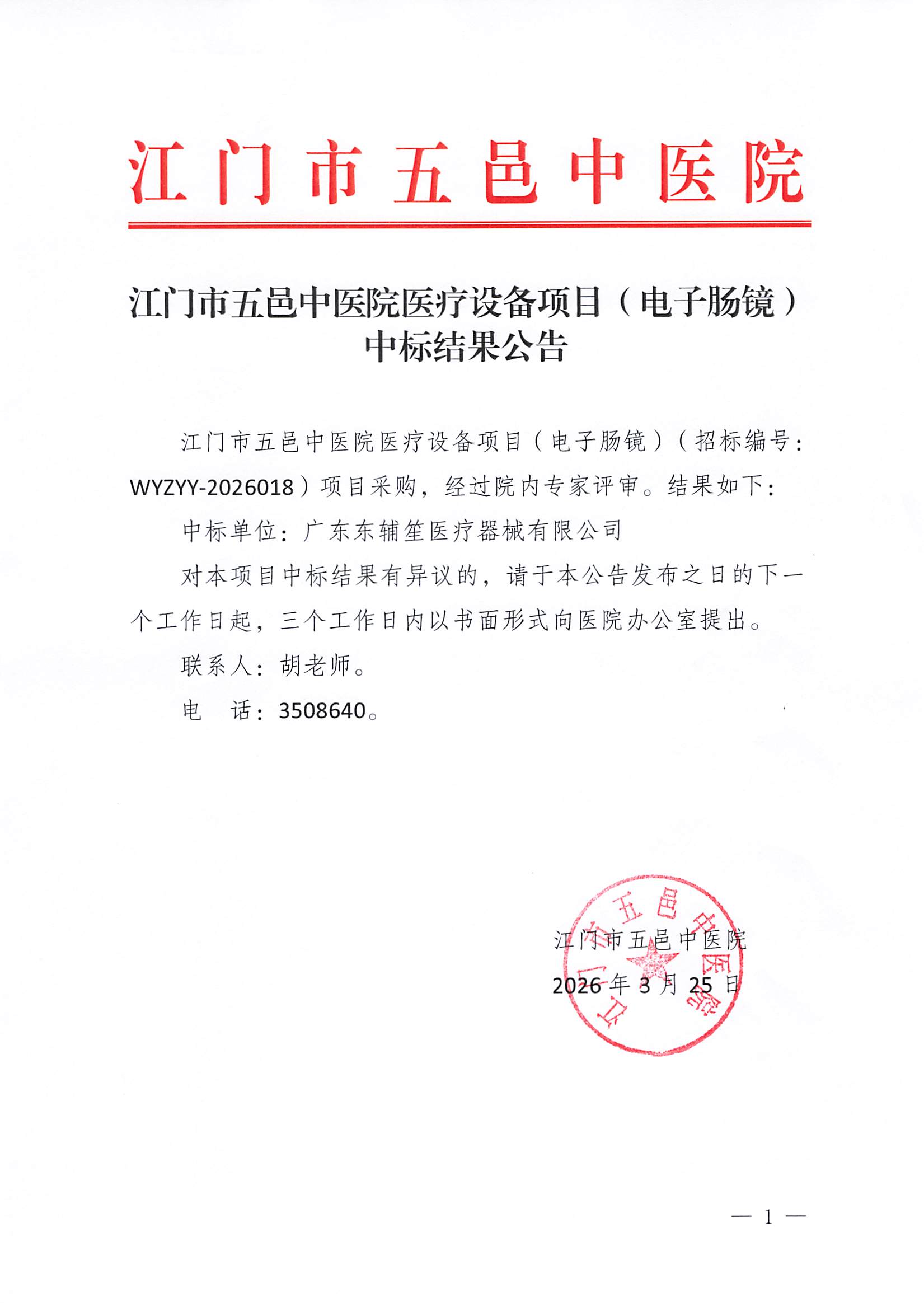 江门市五邑中医院医疗设备项目(电子肠镜)中标结果公告