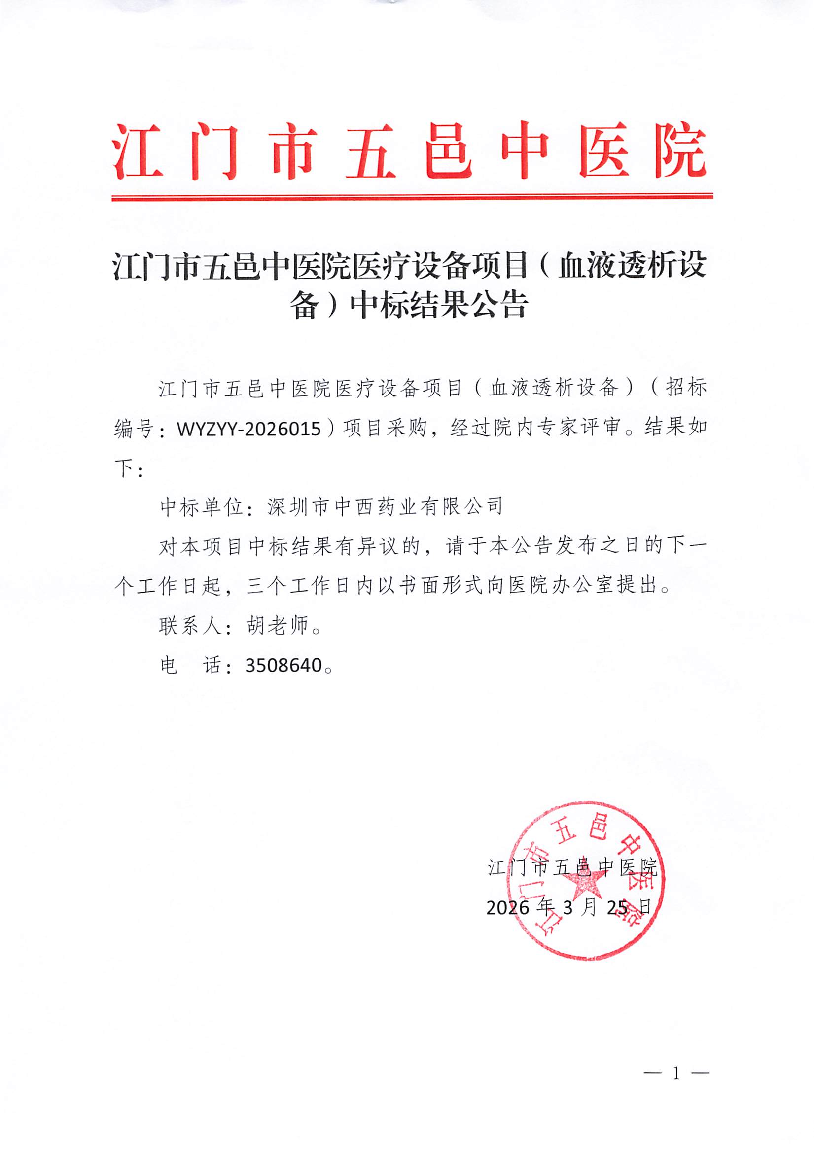 江门市五邑中医院医疗设备项目(血液透析设备)中标结果公告