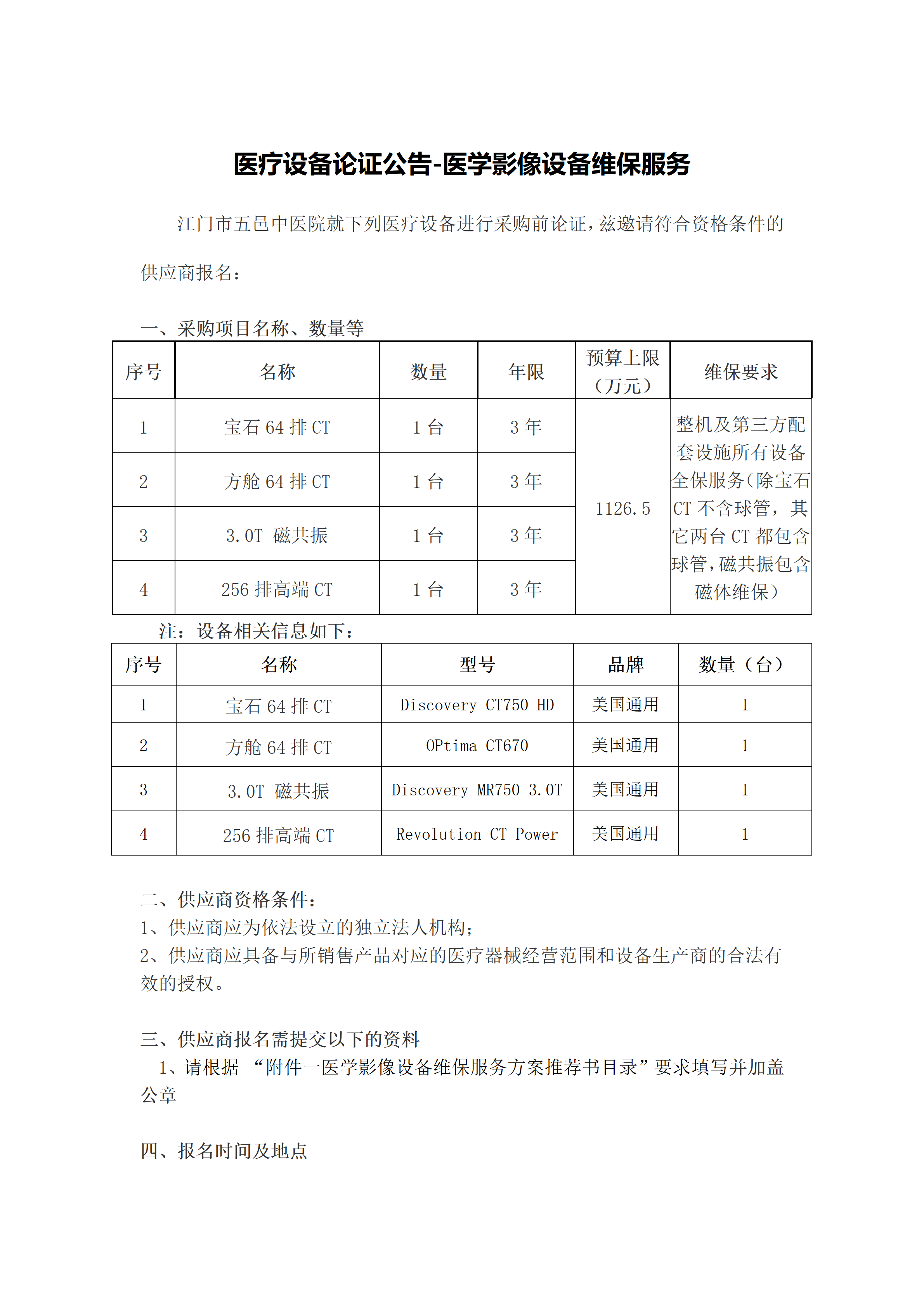 医疗设备论证公告-医学影像设备维保服务