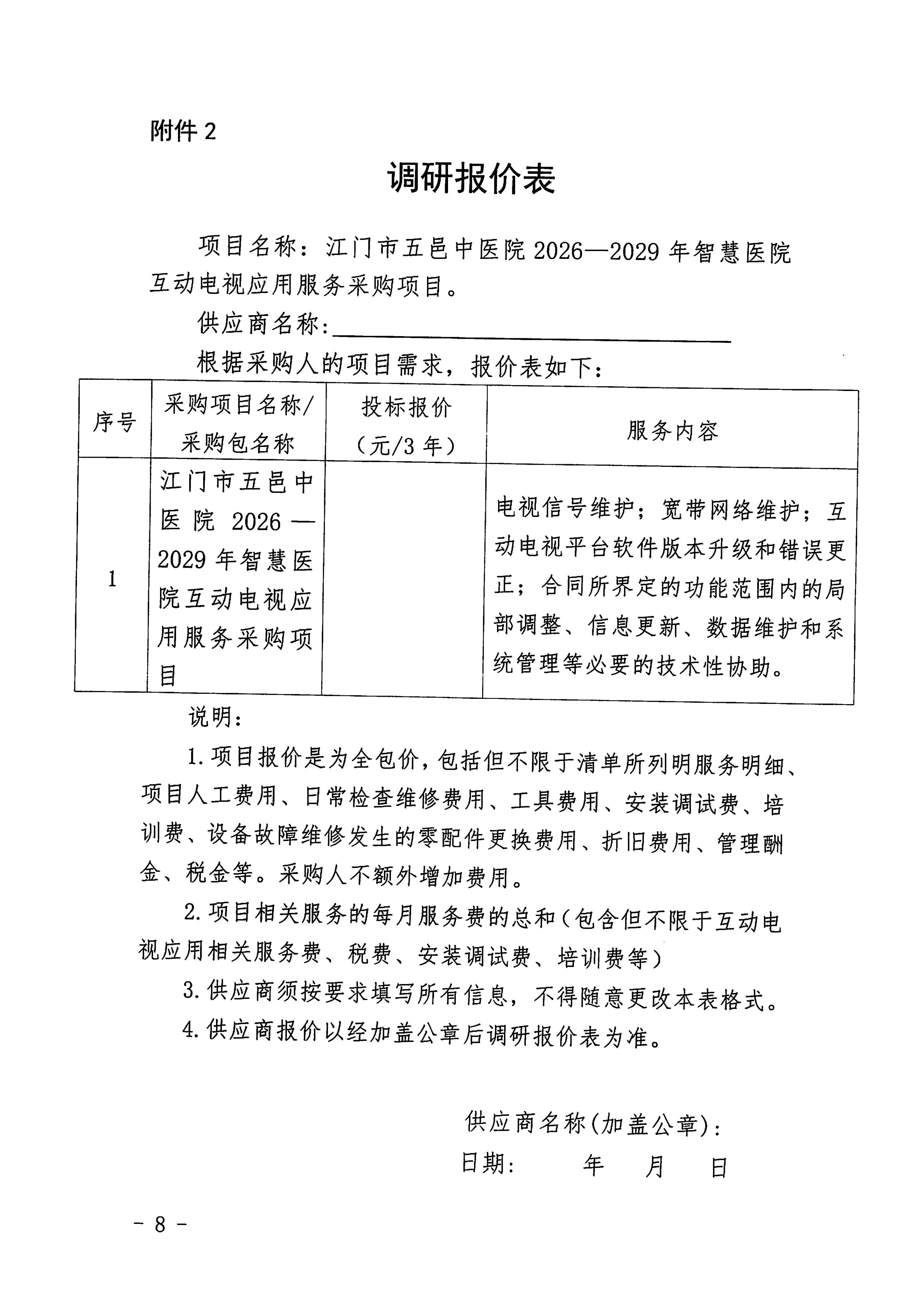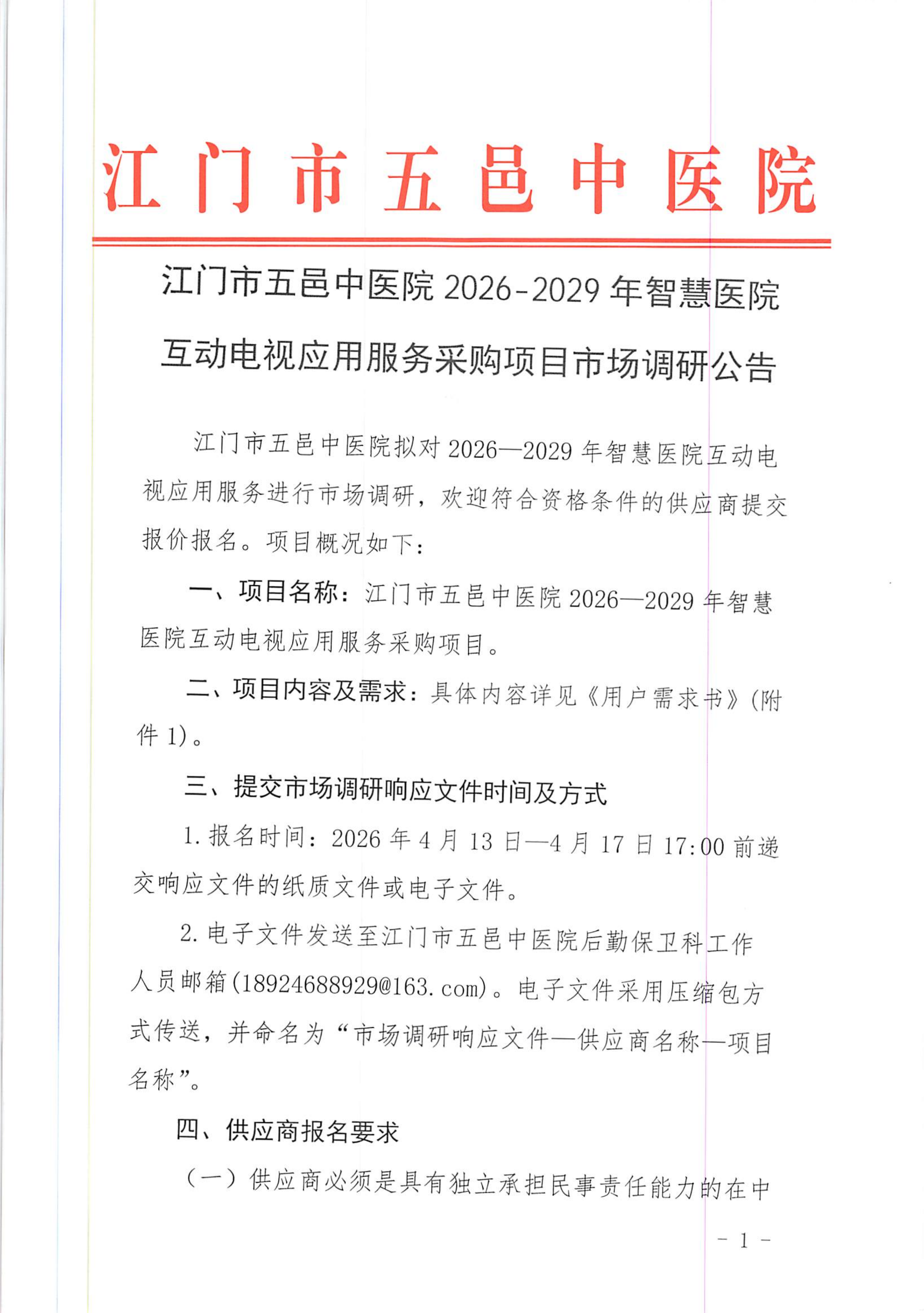 江门市五邑中医院2026-2029年智慧医院互动电视应用服务采购项目市场调研公告