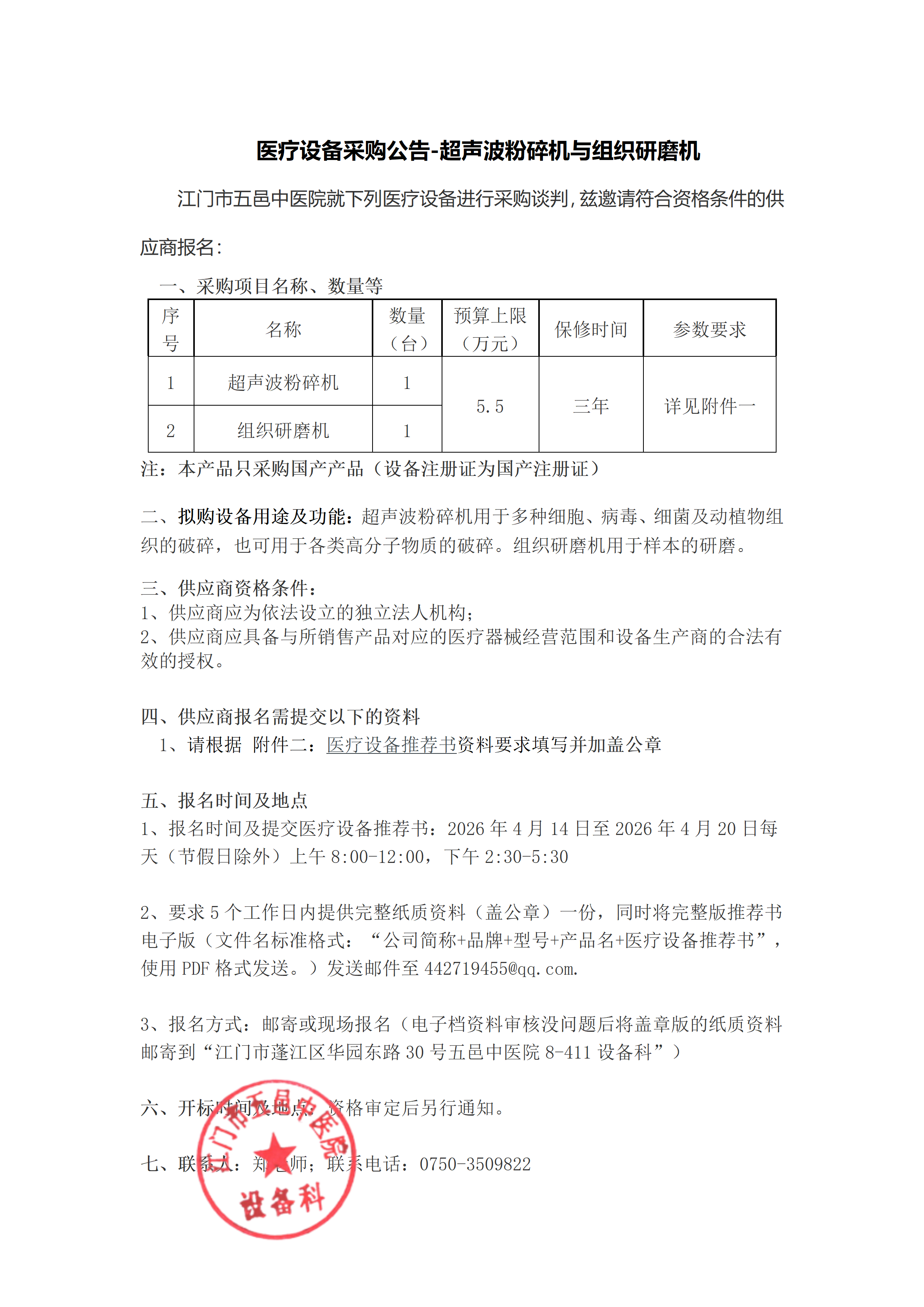 医疗设备采购公告——超声波粉碎与组织研磨机