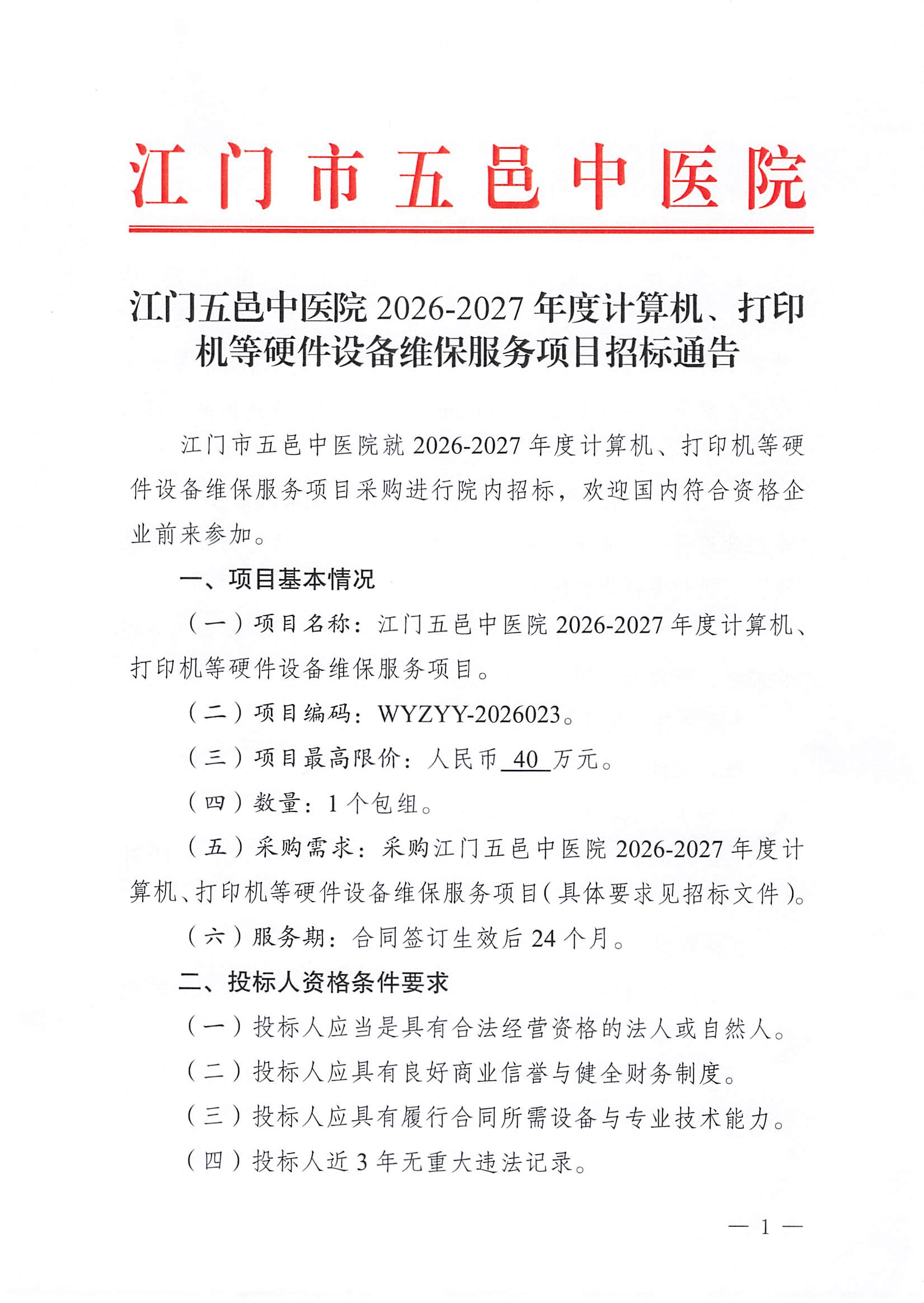 江门五邑中医院2026-2027年度计算机、打印机等硬件设备维保服务项目招标通告