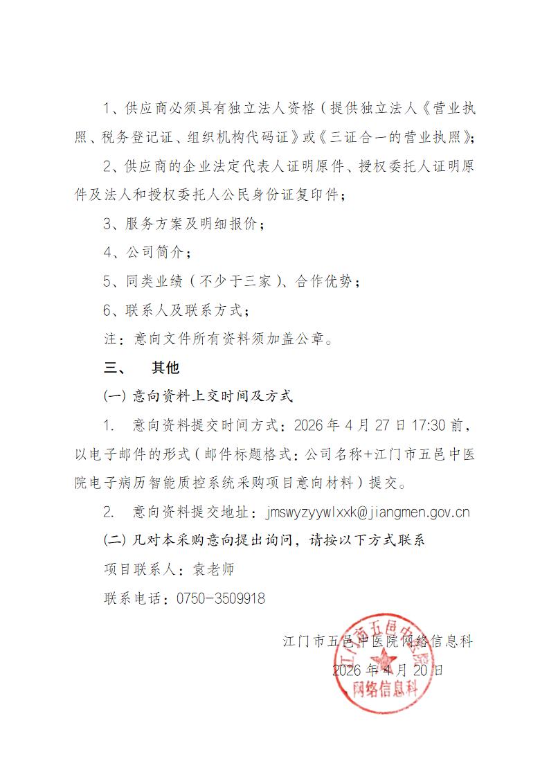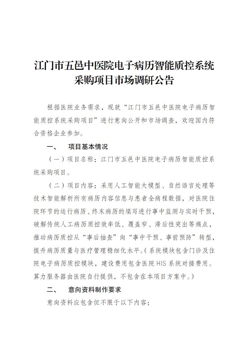 江门市五邑中医院电子病历智能质控系统采购项目市场调研公告