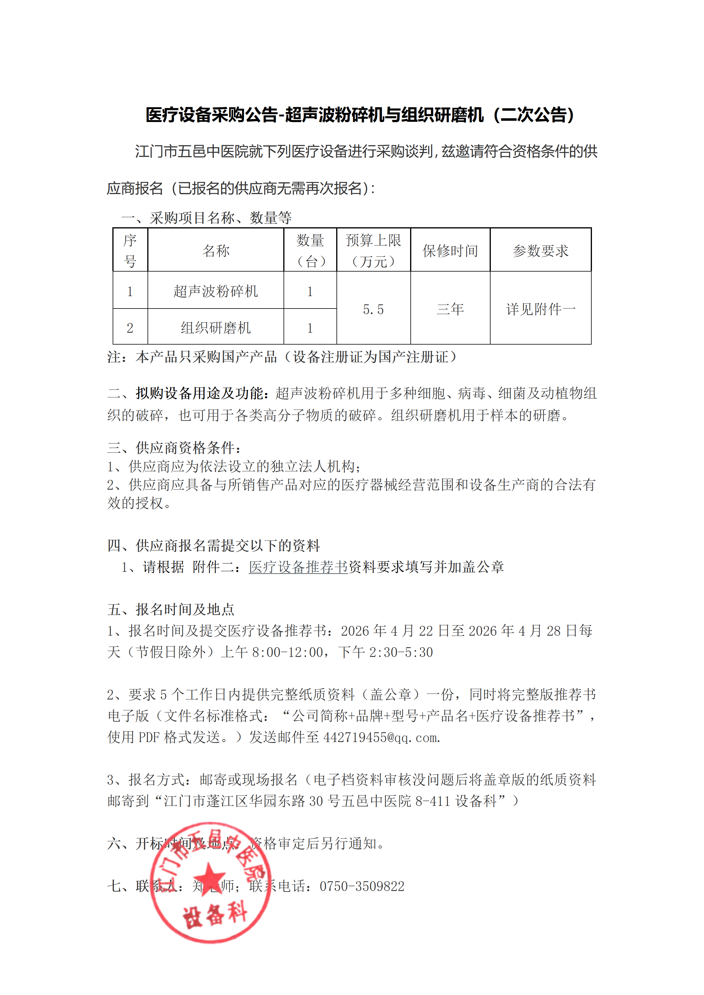 医疗设备采购公告-超声波细胞粉碎机与组织研磨机(二次公告)