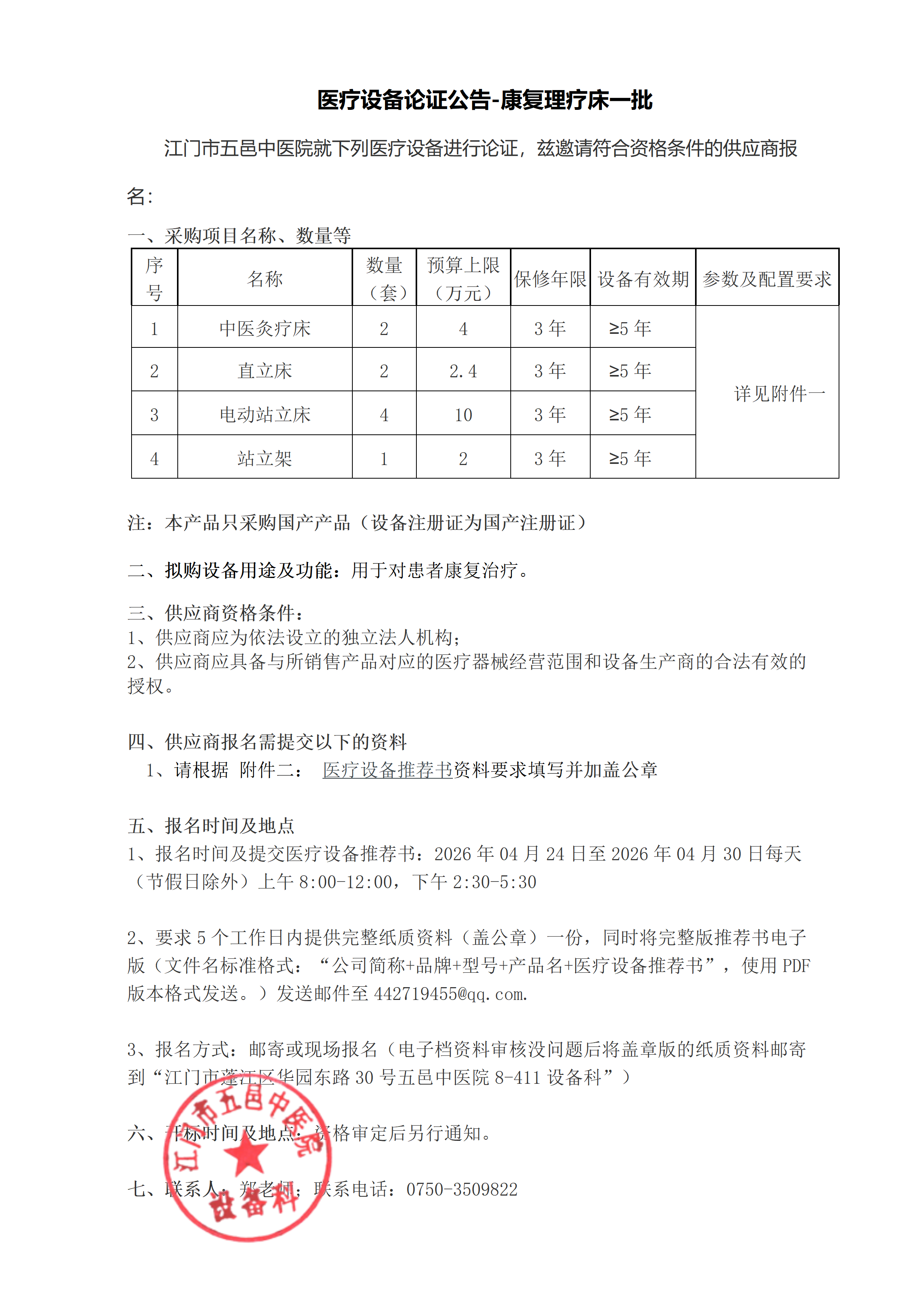 医疗设备论证公告——康复理疗床 一批